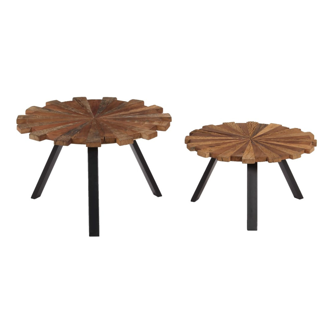 Associez ces tables basses en bois massif à un canapé en lin, un tapis en jute et des accessoires en fer forgé pour une décoration bohème et vintage réussie.