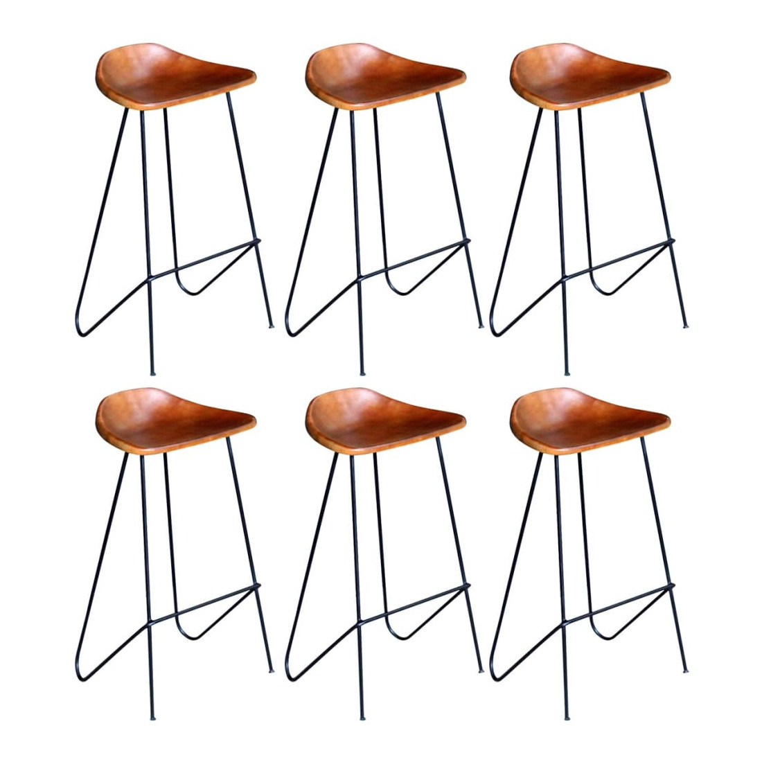 Chaise de bar industrielle en lot de 6 en cuir véritable Brun
